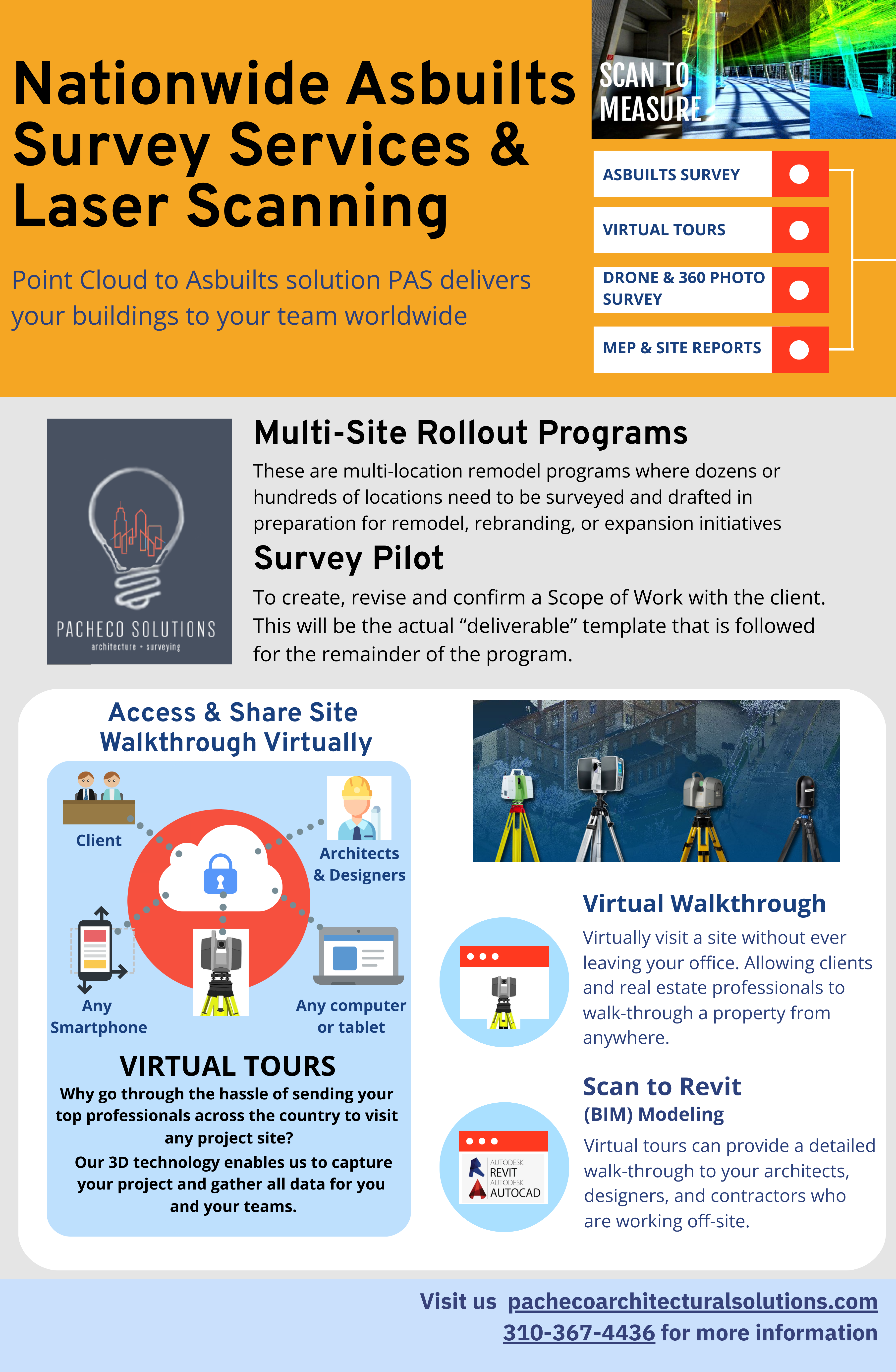 Pacheco Architectural Solutions an as-builts survey services company. We specialized in multi-site roll-out programs, we deliver our drawings in Revit or AutoCAD. Our 3D laser scanning method captures as-builts rapidly and precisely. We have years of experience with site surveys and architectural 3D BIM modeling, handling the scheduling and coordination of field site surveying nationwide.